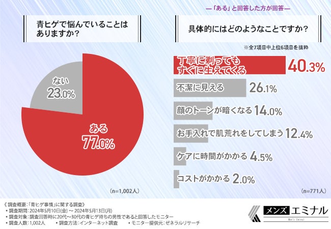 そこで、「青ヒゲで悩んでいることはありますか?」と質問したところ、7割以上の方が『ある(77.0%)』と回答しました。
