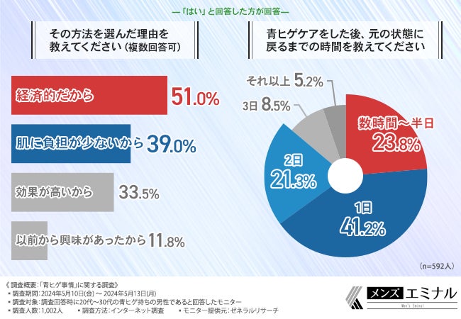 そこで、「青ヒゲケアをした後、元の状態に戻るまでの時間を教えてください」と質問したところ、『数時間~半日(23.8%)』『1日(41.2%)』『2日(21.3%)』『3日(8.5%)』『それ以上(5.2%)』と回答しました。