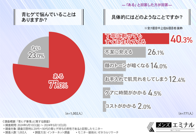 そこで、「青ヒゲで悩んでいることはありますか?」と質問したところ、7割以上の方が『ある(77.0%)』と回答しました。