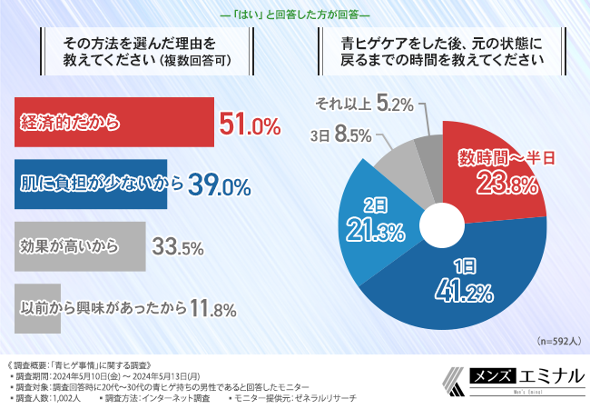 そこで、「青ヒゲケアをした後、元の状態に戻るまでの時間を教えてください」と質問したところ、『数時間~半日(23.8%)』『1日(41.2%)』『2日(21.3%)』『3日(8.5%)』『それ以上(5.2%)』と回答しました。