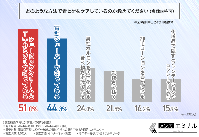 次に、「どのような方法で青ヒゲをケアしているのか教えてください(複数回答可)」と質問したところ、『シェービングクリームとT字カミソリで剃っている(51.0%)』と回答した方が最も多く、『電動シェーバーで剃っている(44.3%)』と続きます。