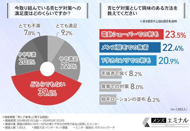 最後に、「青ヒゲ対策として興味のある方法を教えてください」と質問したところ、『電動シェーバーでの剃毛(23.5%)』と回答した方が最も多く、『メンズ脱毛での施術(22.4%)』『T字カミソリでの剃毛(20.9%)』と続きました。