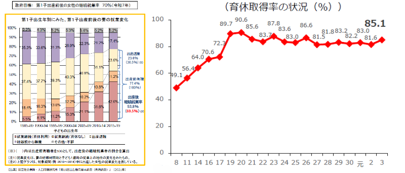 ◆日本における第1子出産後の女性の継続就業率は69.5%※2、育休取得率は85.1%※3