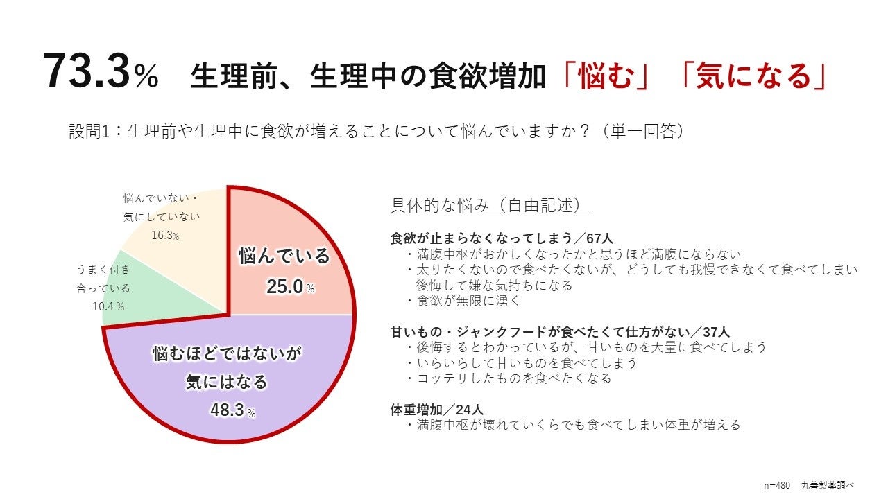 さらに、生理前に食欲が増加すると回答した女性の73.3%が食欲増加について「悩む」「気になる」と回答。