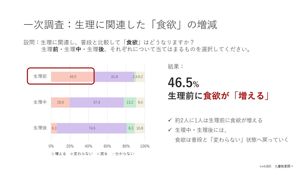 まず、生理期における食欲の増減を調査したところ、46.5%の女性が生理前に食欲が増えると回答しました。また、生理中、生理後と生理が進むにつれ、食欲は普段と「変わらない」と回答する女性の割合が増えることが確認されました。