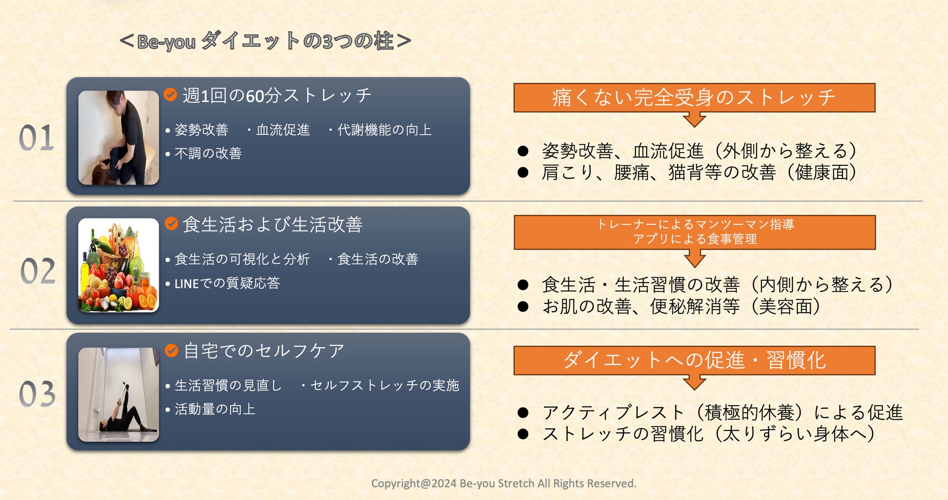 Be-you ダイエットは「無理なく健康的なダイエット」をコンセプトに、ストレッチ(外側からのアプローチ)と食事管理(内側からのアプローチ)により、減量・サイズダウン・姿勢改善につなげるメニューとなっております。