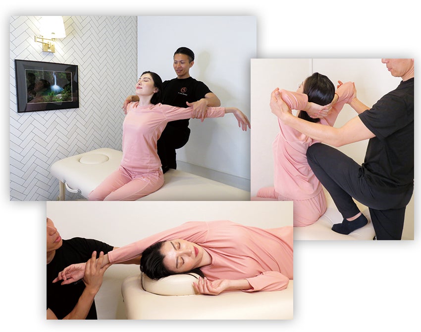 こだわりの店内はゆったりとした高級感溢れる作りで、アロマの香る個室にて完全受身でのストレッチ。「施術後に身体が軽くなる!」との感想を多くいただき、無理に伸ばすことのない”痛くないストレッチ”としてお客様にご利用いただいております。