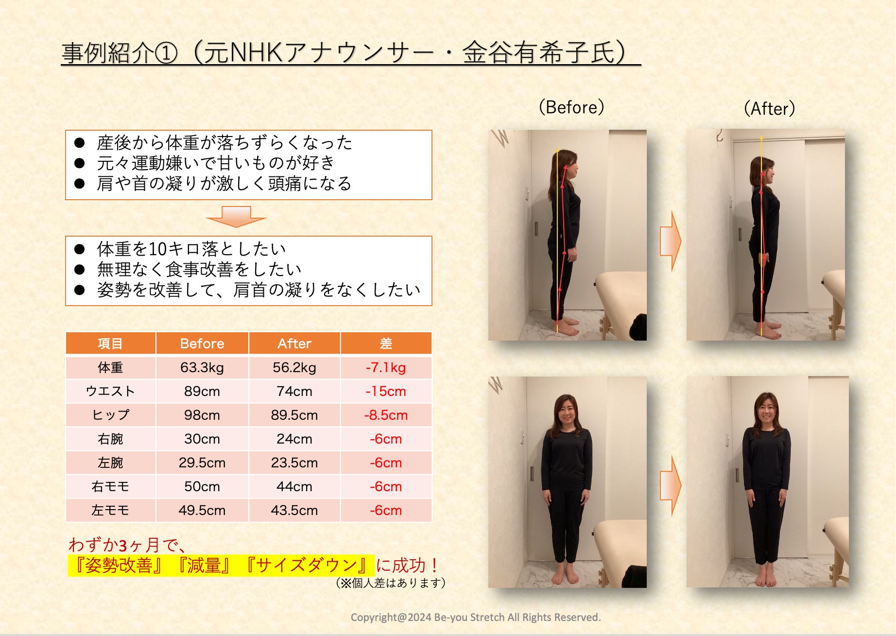 金谷有希子氏と同様、姿勢改善によるウエストダウンは11cm、わずか数回の施術で見た目にも分かる大きく変化が現れました。体重は2.5キロ減となっており、順調なペースで進んでいます。