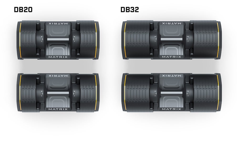 自宅でのトレーニングをさらに効果的にするために、2つのオプションから選べるアジャスタブル・ダンベルをご用意しました。2kg刻みで最大20kgのDB20と、2kg刻みで最大32kgのDB32。