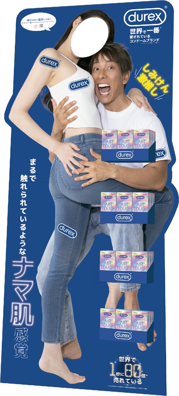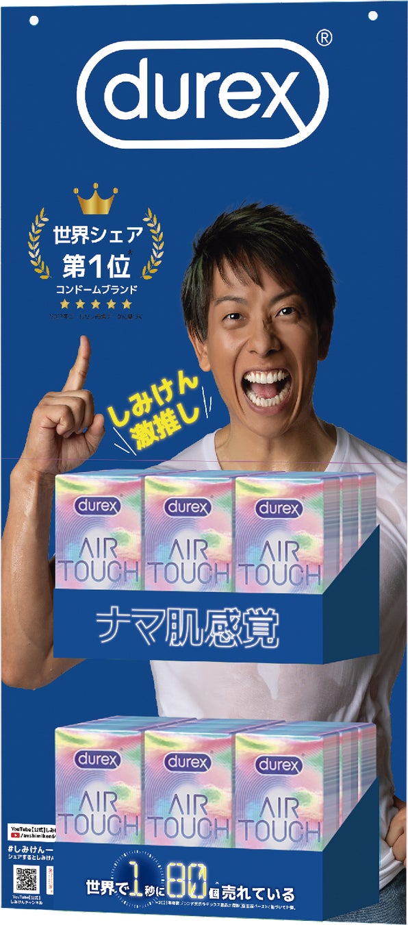 実店舗では、しみけんさんの店頭販促ディスプレイにて「デュレックス エアタッチ たっぷりゼリー付き コンドーム」の販売中。等身大のしみけんさんと一緒に記念撮影ができるタイプの顔はめパネルも登場します。(※一部店舗での取り扱いです。)是非、記念撮影してSNSで投稿してください。