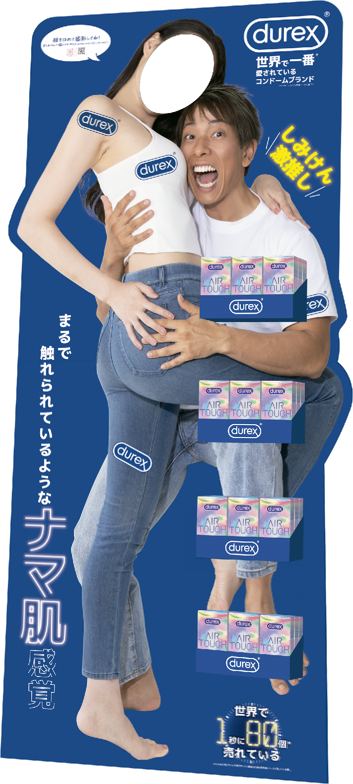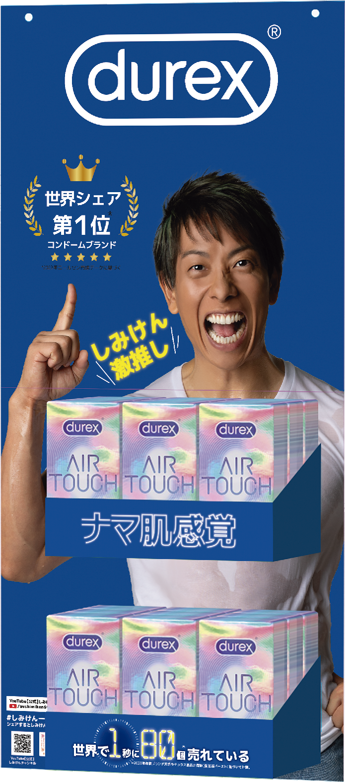 実店舗では、しみけんさんの店頭販促ディスプレイにて「デュレックス エアタッチ たっぷりゼリー付き コンドーム」の販売中。等身大のしみけんさんと一緒に記念撮影ができるタイプの顔はめパネルも登場します。(※一部店舗での取り扱いです。)是非、記念撮影してSNSで投稿してください。