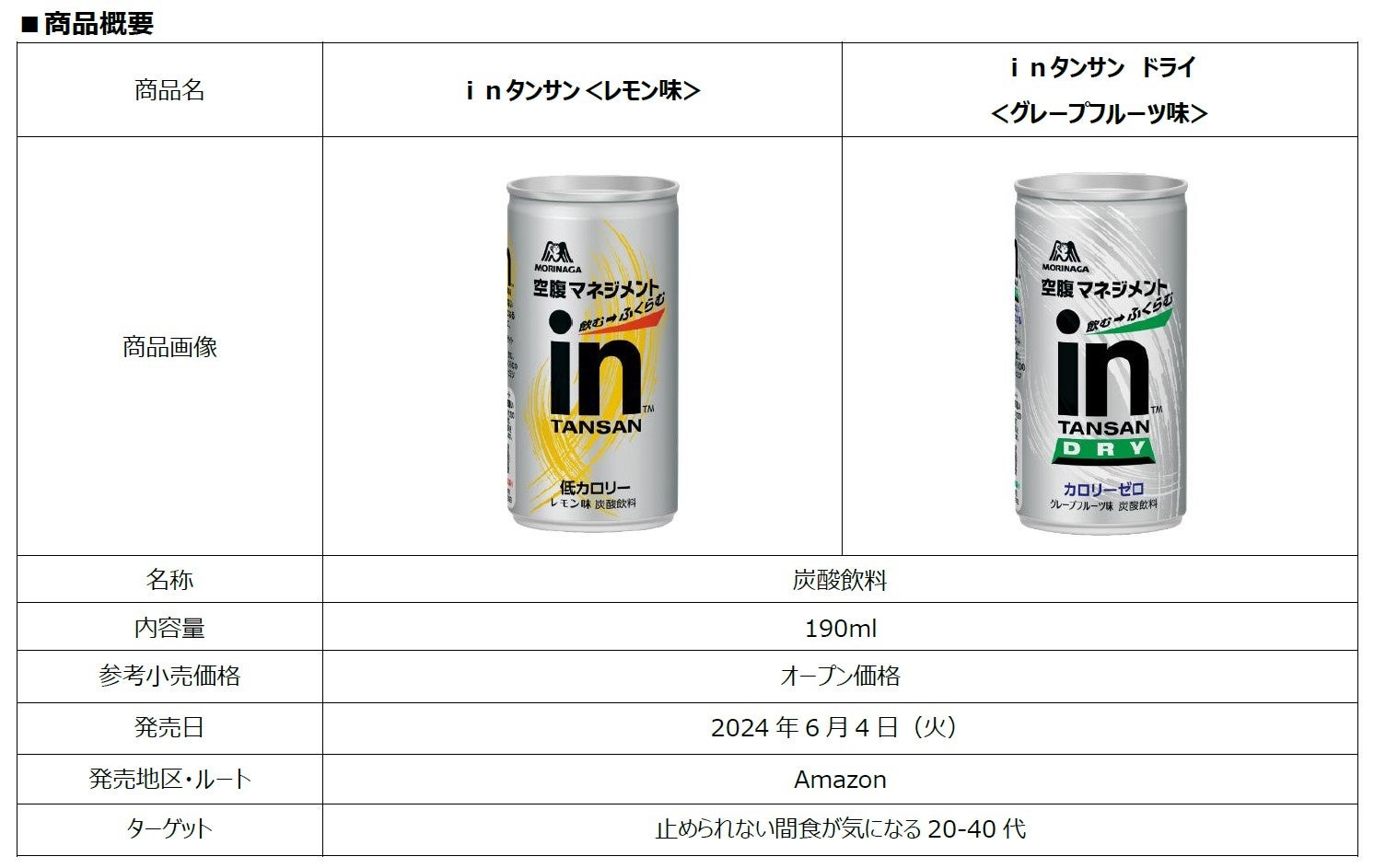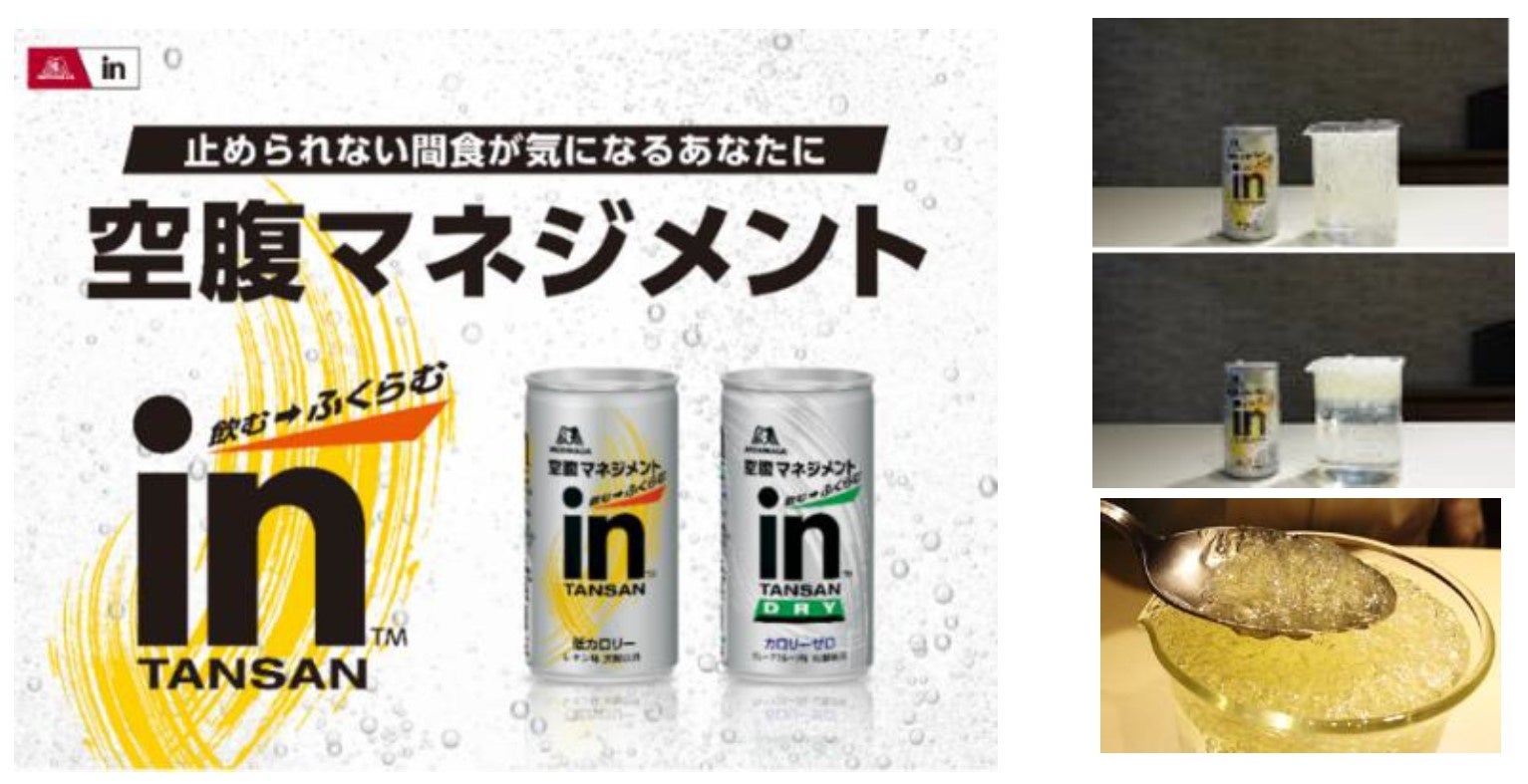 本商品は、 「inゼリー」の技術を応用した炭酸飲料で、胃液のような強い酸と反応してゼリー状に変わってふくらむ新感覚ドリンクです。 仕事中についつい間食を食べ過ぎてしまうことが気になる方をメインターゲットとし、無計画な間食を自己管理する「空腹マネジメント」のためのドリンクを開発いたしました。また、商品発売にあわせ、パフォーマンスアップのサポートや従業員間のコミュニケーション促進を目的に、本社オフィスに自由に「inタンサン」を飲用できる「空腹マネジメントブース」を開設しました。