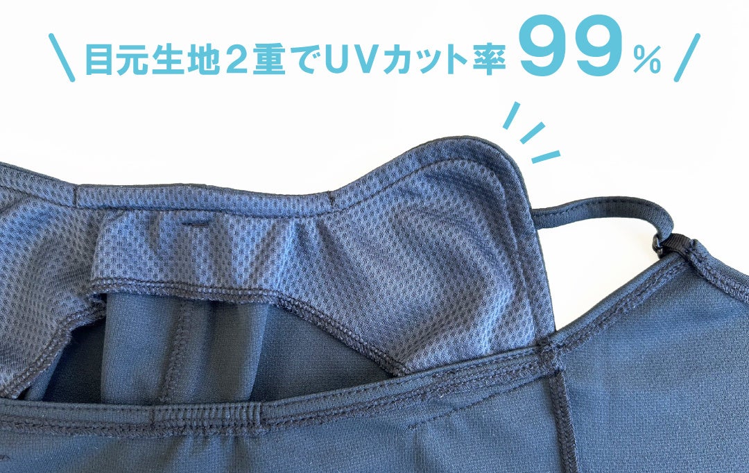 チタンが練り込まれた日本製の高機能糸を使用することで、何度洗濯をしてもUVカット効果が持続します。また、強い日差しの下でも遮熱効果と打ち水クーリング効果により、フェイスカバー内の温度上昇を抑え、従来のポリエステルと比較して3℃以上涼しく着用することができます。