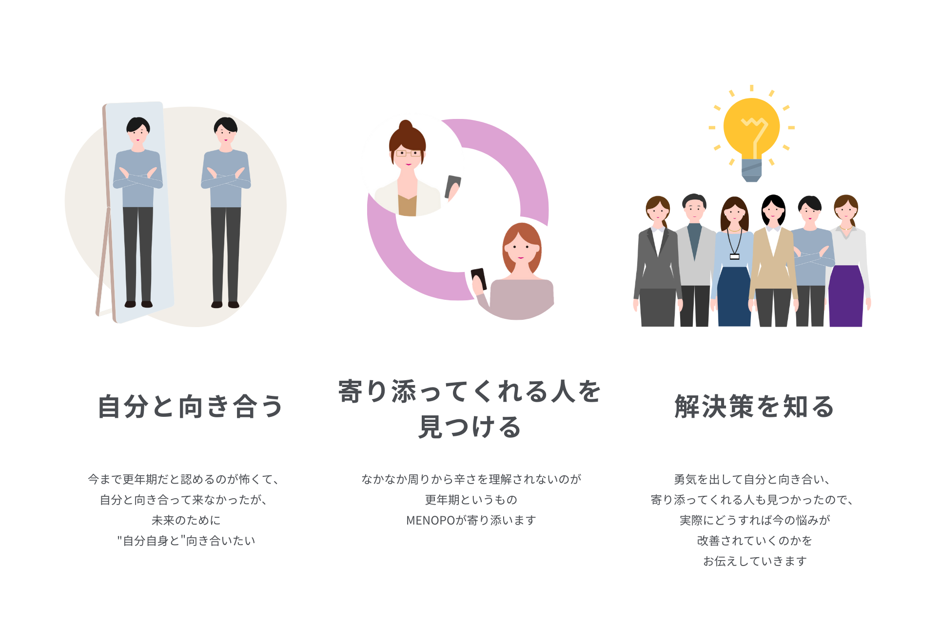 更年期に訪れる男女の閉ざされた悩みに寄り添い、医師や専門家による信頼性の高い情報に加えて、実際のリアルな体験談やみんなの相談事例などをオンラインメディアとして発信しています。