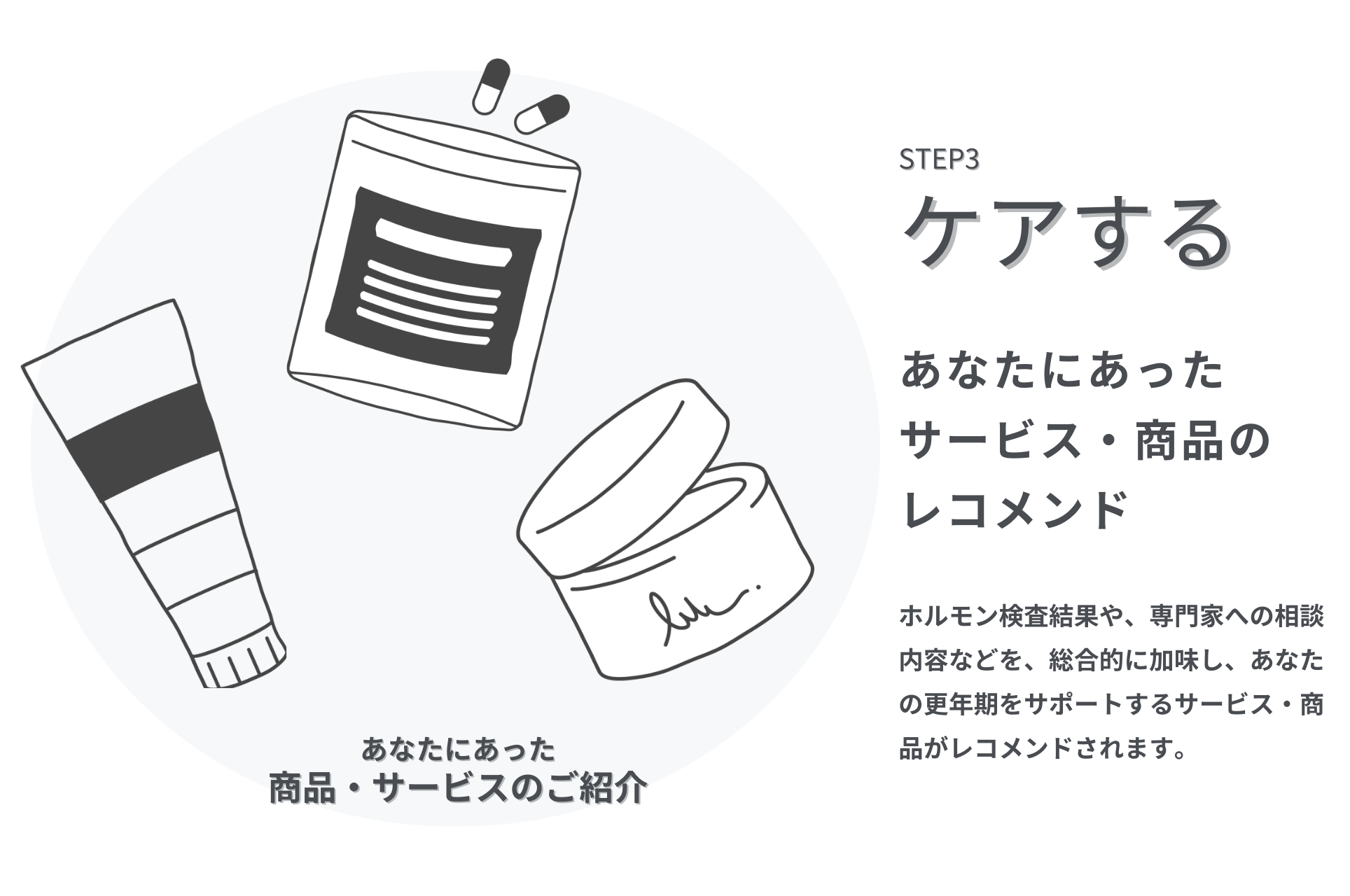 MENOPO CHECK FOR WOMENで調べたホルモンの状態や症状によって、ケアするためのサービスや商品がレコメンドされます。