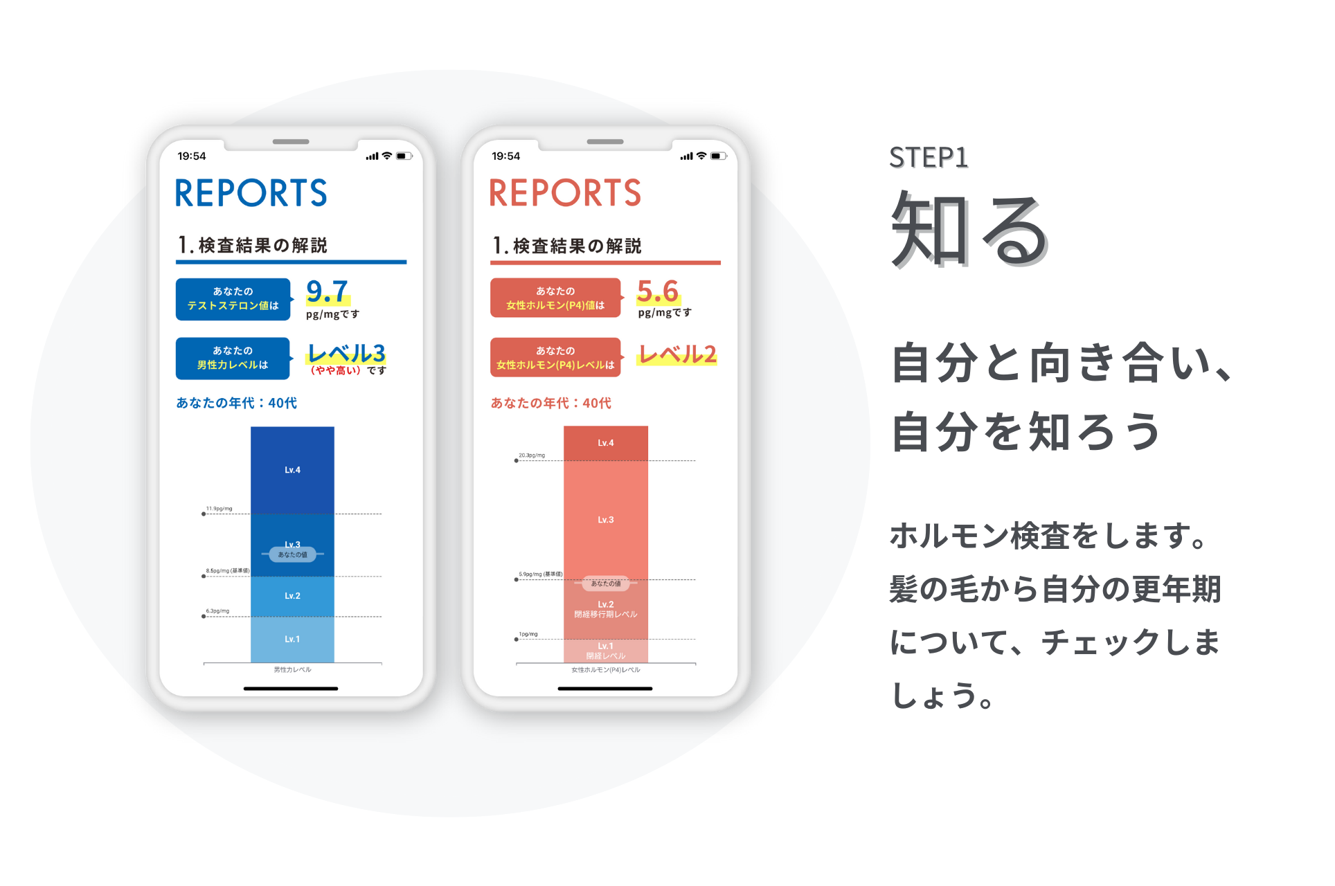 臨床試験で得た量の分布から、自分自身が更年期を起点にしたどの位置にいるのかを示し、4段階で女性ホルモンのレベルを評価します。