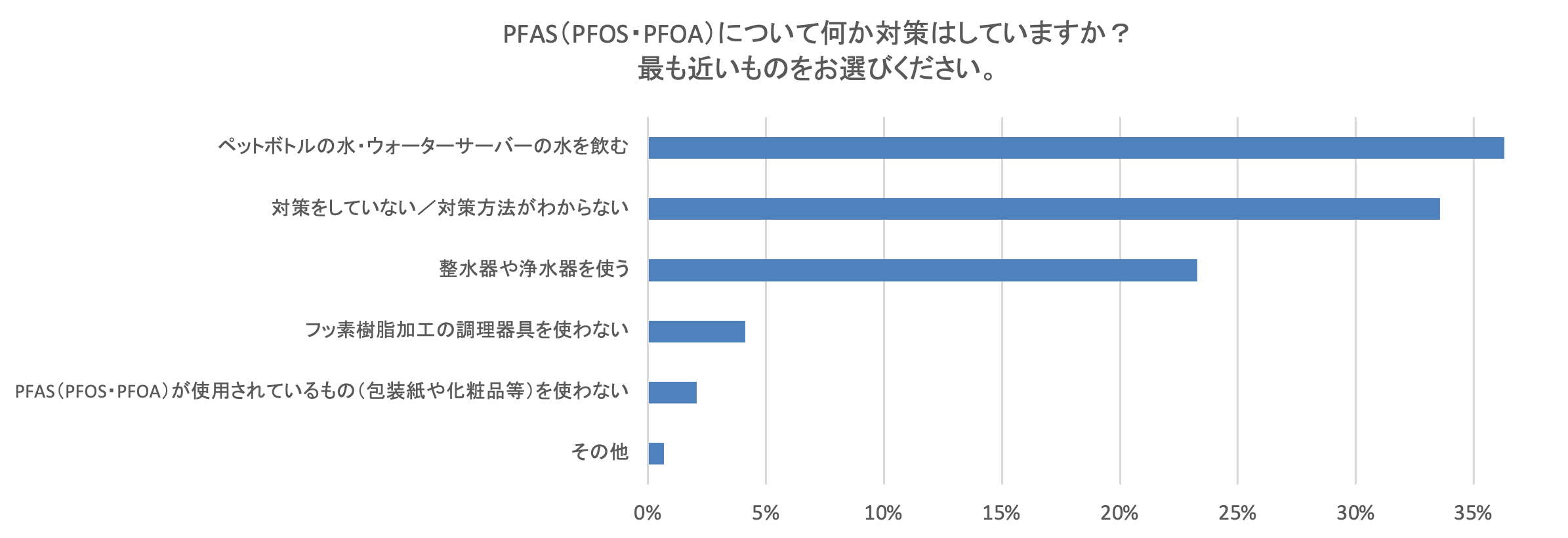 「聞いたことがある」と回答した146人に対し、「何か対策をしていますか」と尋ねたところ、1位「ペットボトルの水・ウォーターサーバーの水を飲む」(36%)に僅差の2位に「対策をしていない/対策方法がわからない」(34%)が入っており、対策や自衛手段の認知・理解度が低いことが伺えます。3位には「整水器や浄水器を使う」(23%)が入っており、飲用水に配慮することで自衛する方が多いことが分かります。