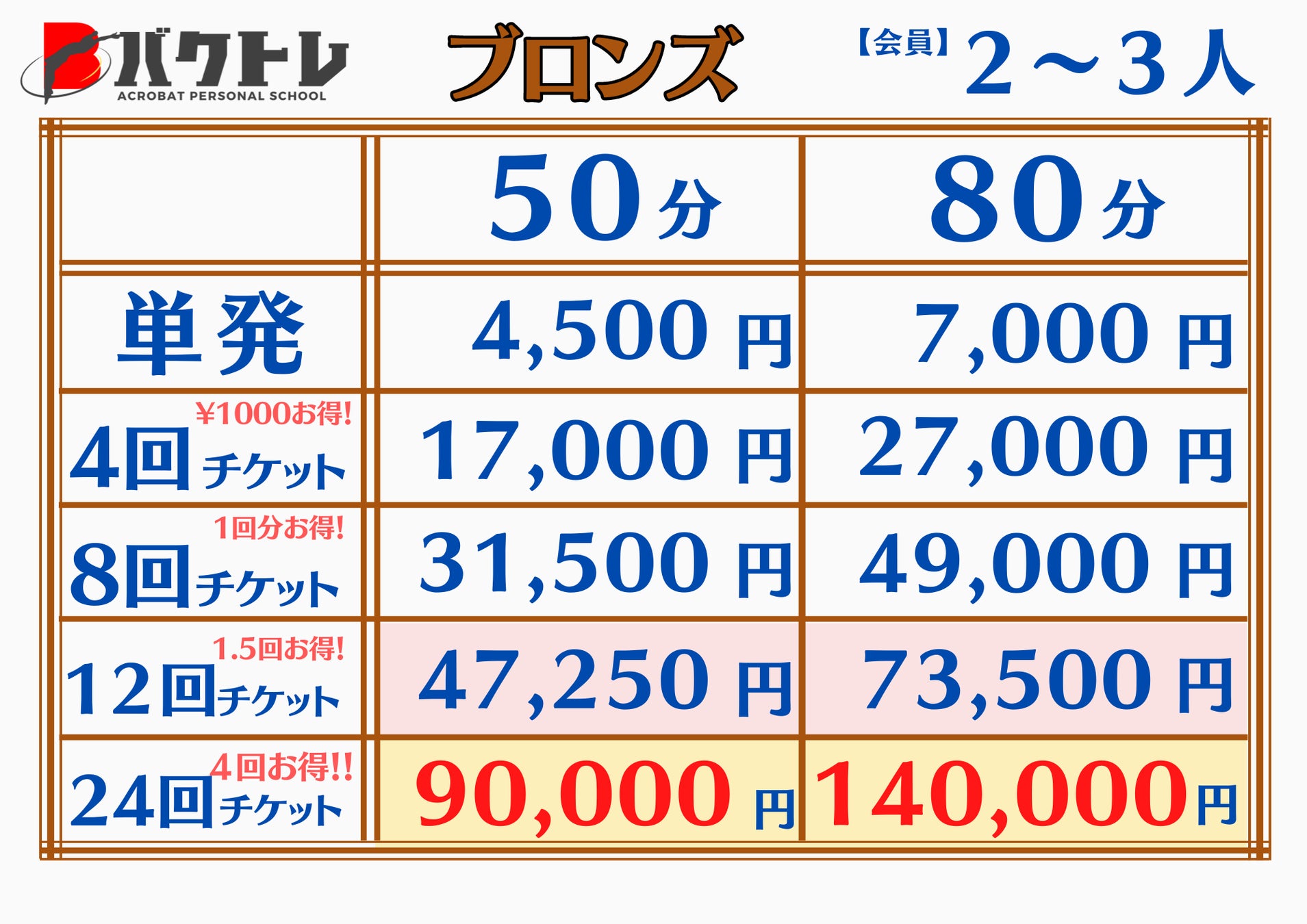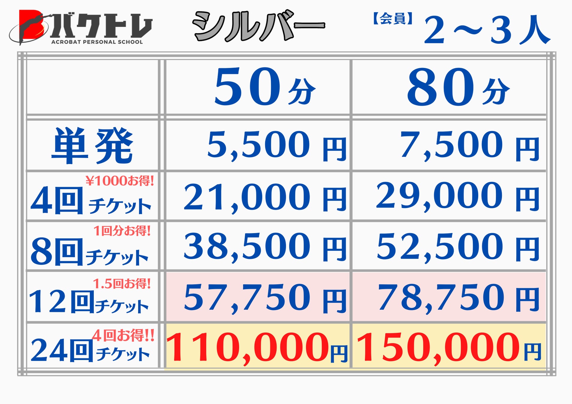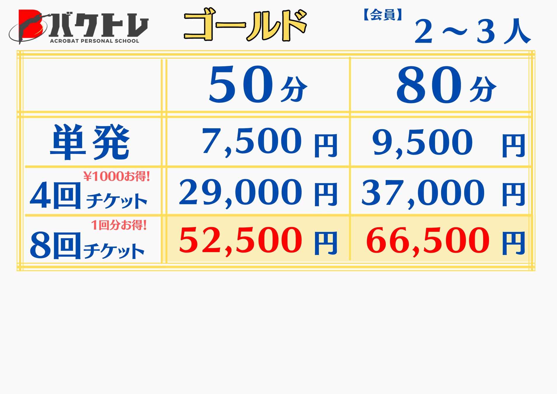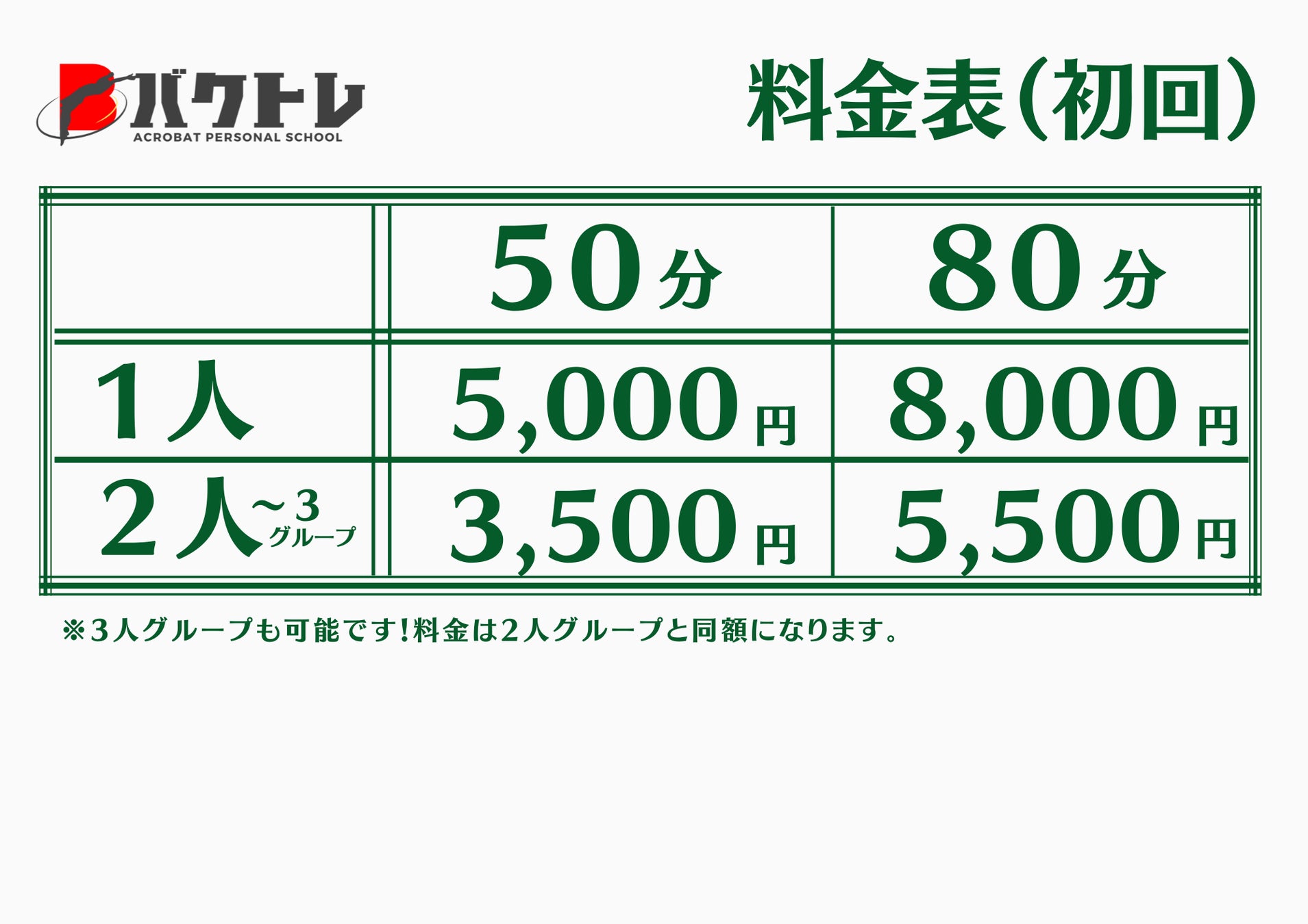 初回体験レッスンの料金表と2回目以降の料金表になります。(2〜3人グループで料金が異なります。)