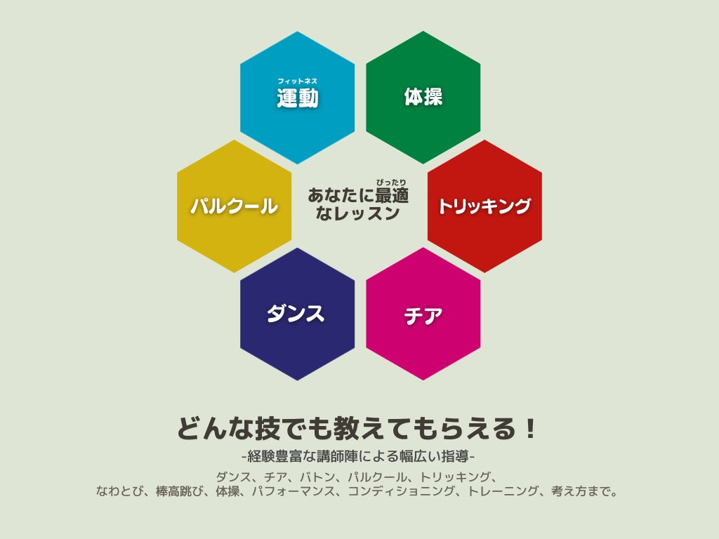 ダンス、チア、バトン、パルクール、トリッキング、なわとび、棒高跳び、体操、昔からの憧れなど、全ての人に合わせた最適なレッスンを提供するのがバクトレです。教えられないアクロバットはありません!