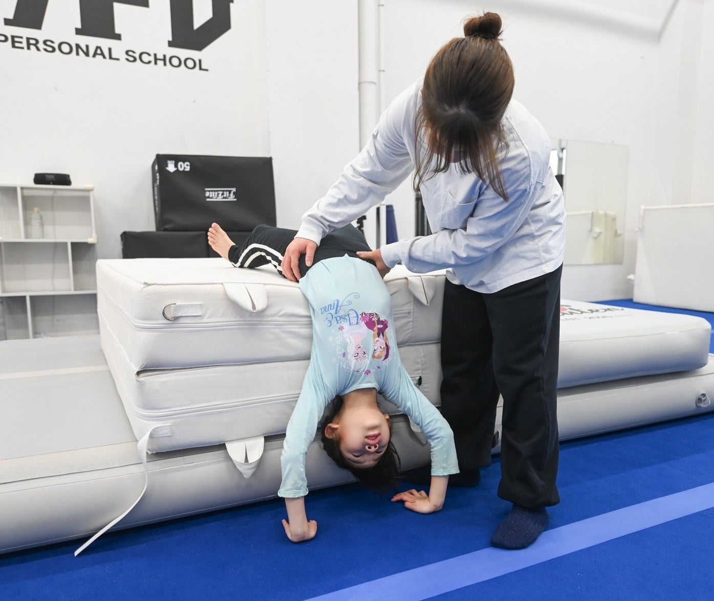 バク転などのアクロバットもさることながら、ストレッチや、チアの動き、基礎体力トレーニング等を取り入れるなどして一般のアクロバット教室にはない「マンツーマンだからできる」を行っています。