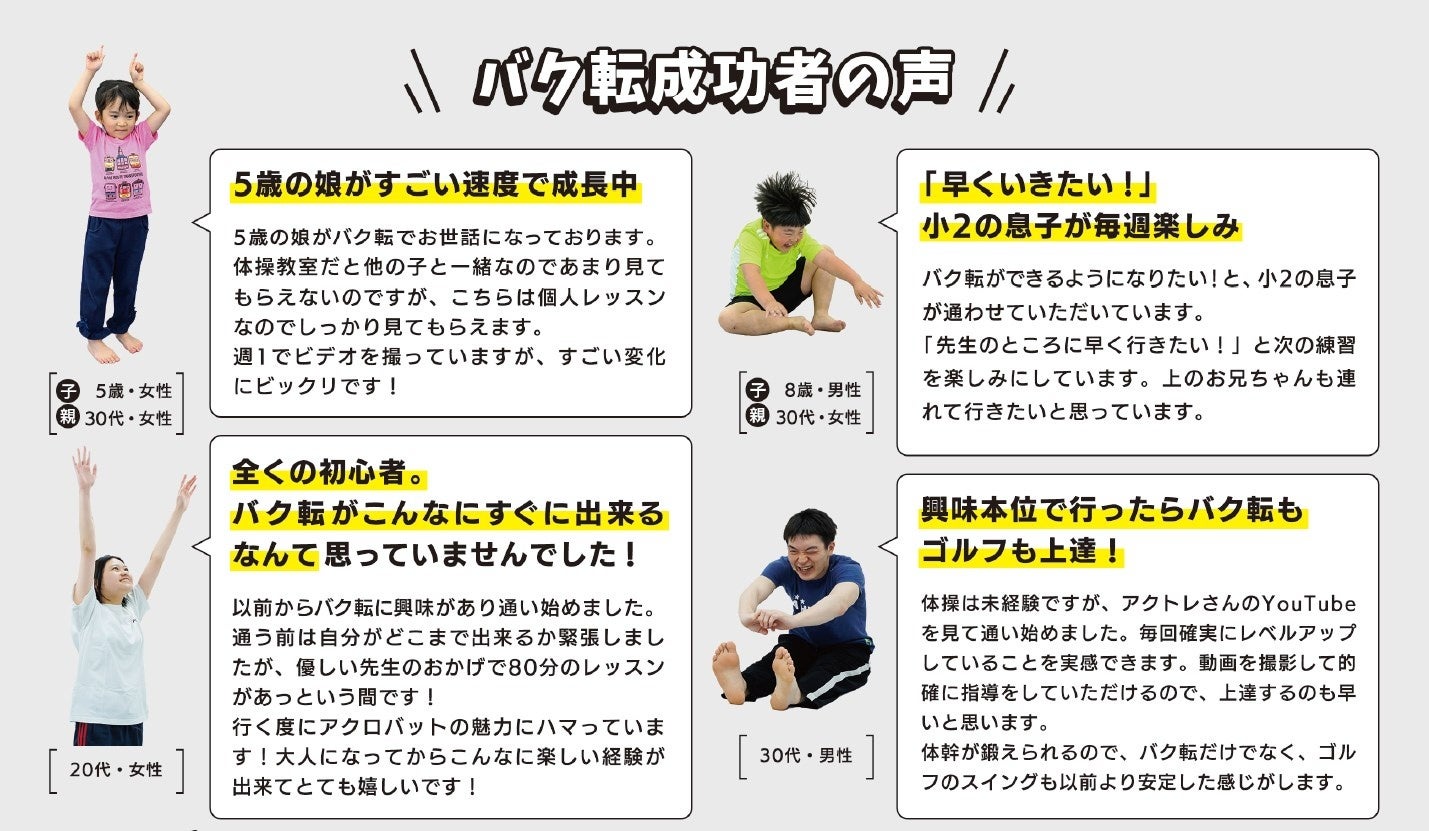 実際にバク転を行っていただいたお客様の写真や、お声です。