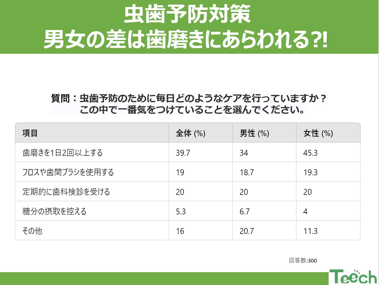 今回、20代から30代の男女を対象に行った「虫歯予防のために毎日どのようなケアを行っていますか?この中で一番気をつけていることを選んでください。」というアンケートを実施しました。そして、このアンケートから、興味深いデータが得られました。