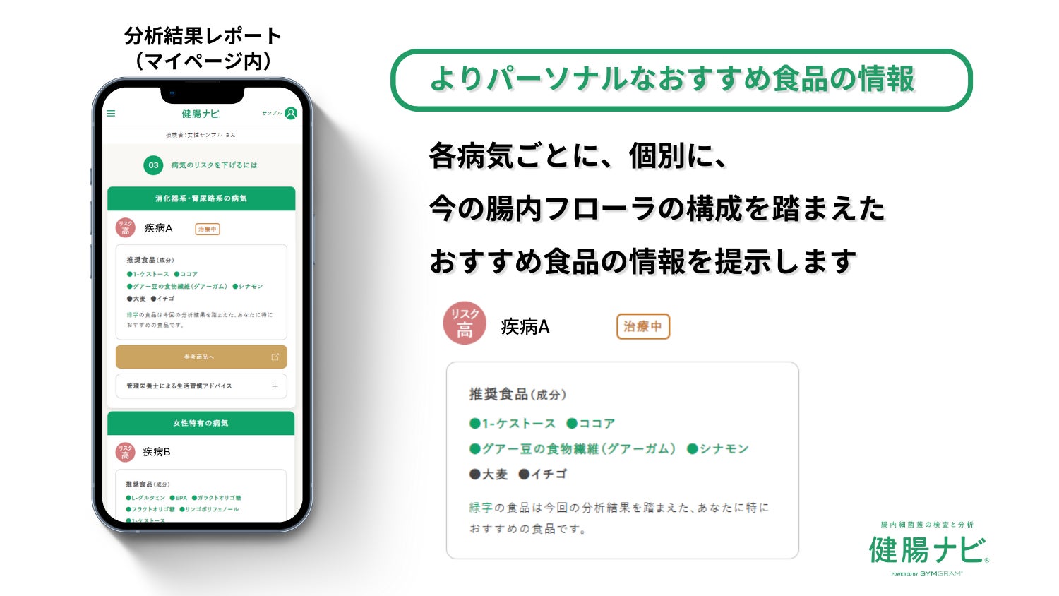 当サービスでは、病気のリスクの分析結果だけでなく、リスクが「高」または「中」と推定された病気に関して、リスクを下げるためのおすすめ食品の情報を提示するという機能を備えています。今回のバージョンアップにより、各病気において検査結果(腸内細菌叢の構成)を踏まえたおすすめ食品の情報を個別にご提示するという、これまで以上にパーソナルな情報の提供が可能となります。