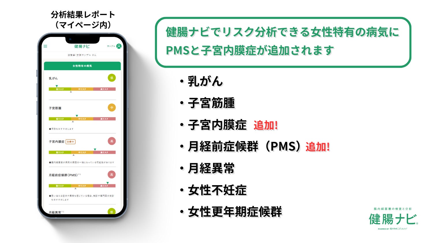 当サービスで最も特長的なレポートコンテンツである病気のリスク分析における分析対象の病気に、多くの女性が悩む「月経前症候群(PMS)」や「子宮内膜症」を追加したほか、「不整脈」や「慢性腎臓病、慢性腎不全」などの病気のリスクも分析できるようになりました。