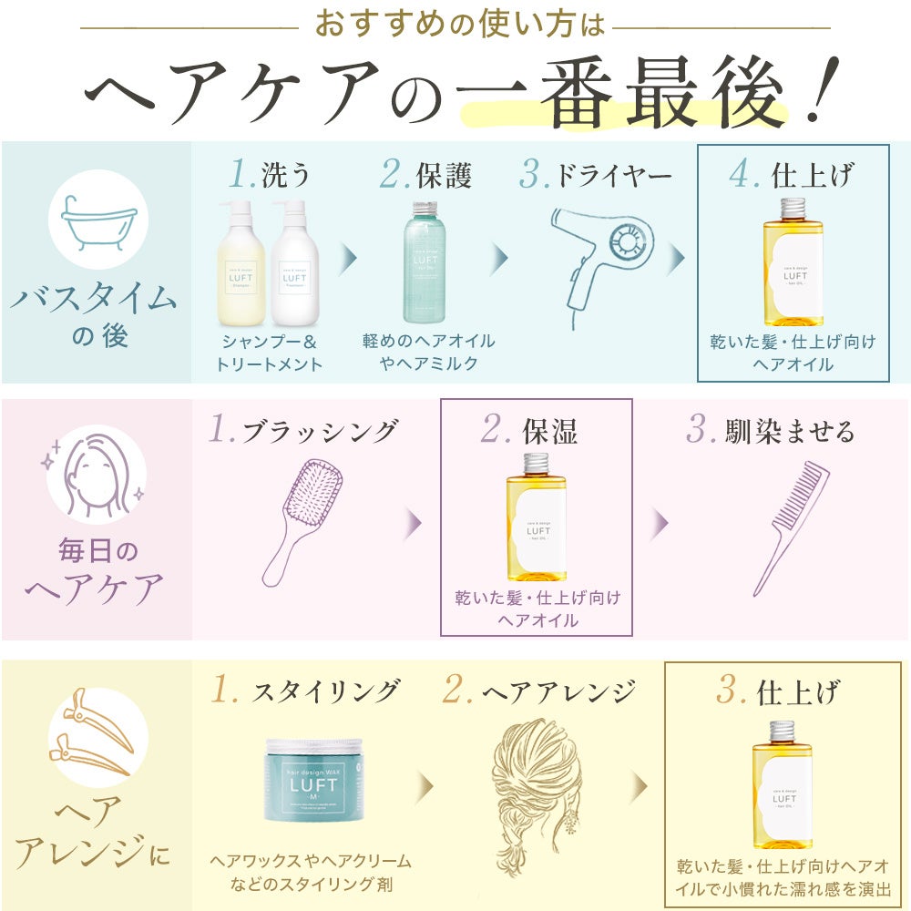 LUFT(ルフト)は、空気のように自然体であなた自身が生まれ持つ魅力を引き出します。サロン帰りにふと感じる、ささやかな感動を演出するような、そんな毎日を彩るデイリーユースプロダクトをお届けします。