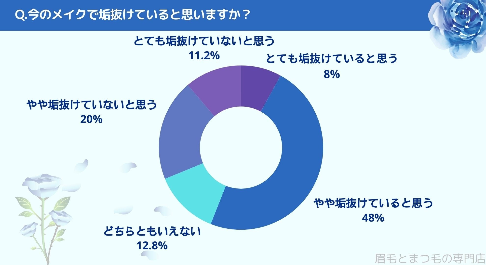 今のメイクで垢抜けていると思うかお聞きしたところ「とても垢抜けていると思う(8%)」、「やや垢抜けていると思う(48%)」、「どちらともいえない(12.8%)」、「やや垢抜けていないと思う(20%)」、「とても垢抜けていないと思う(11.2%)」という結果になりました。