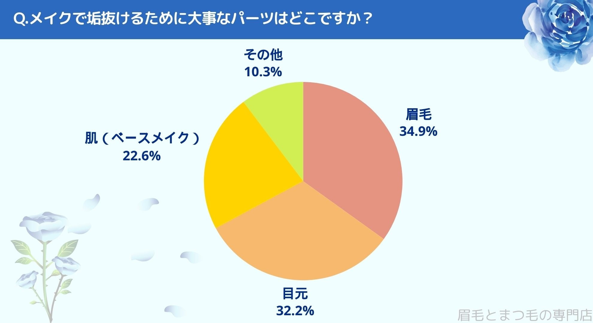 メイクで垢抜けるために大事なパーツをお聞きしたところ「眉毛(34.9%)」、「目元(32.2%)」、「肌(ベースメイク)(22.6%)」、「その他(10.3%)」という結果になりました。