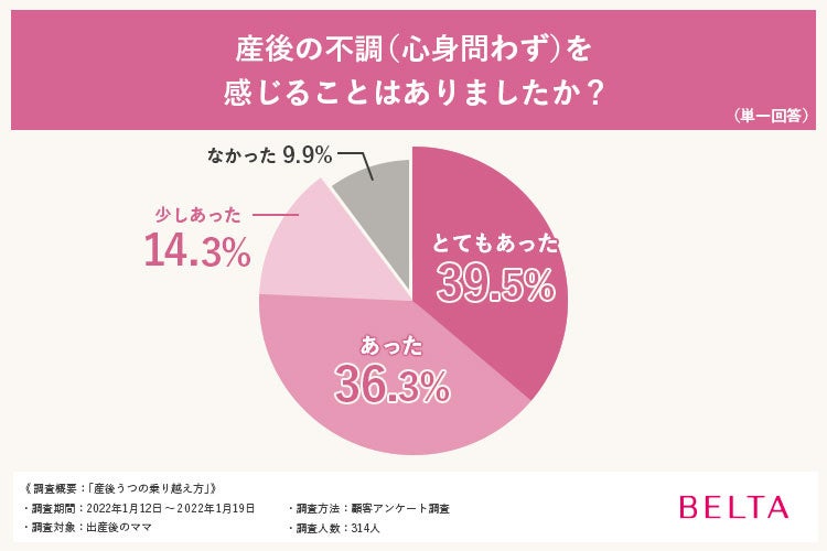 女性を取り巻く社会問題の一つに産後うつがあります。日本産婦人科学会は、産後うつは10%の罹患率があるとしており、10人に1人は産後うつになる可能性があるといわれています。また、BELTAが行ったアンケート調査※1では、産後女性の9割以上は産後に何かしらの心身の不調を感じたことがあるとわかっており、産後うつという診断を受けずとも産後は何かしらの不調を抱える女性が多いことがわかります。