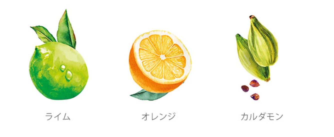 ライム、オレンジ、カルダモンのリフレッシュ感溢れる、ジューシーライムの香り。
