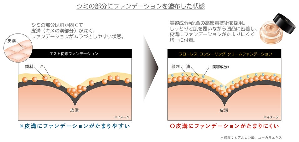 「エスト フローレス コンシーリング クリームファンデーション」は、シミや色ムラなどで思うように仕上げられないという大人の肌悩みに対応したクリーム状のファンデーションです。 美容成分*1を配合しており、まるでとろけるように肌と一体化して密着。肌悩みをなめらかにフィルタリングしながら、まるで肌が柔らいだかのような仕上がりを実現します。 薄いシミならひと塗りで、重ねれば濃いシミまで軽やかにカバーすることができ、コンシーラーのように部分的にも使用できます。ヨレにくく、小じわやほうれい線にも入り込みにくく、大人の肌におすすめのファンデーションです。