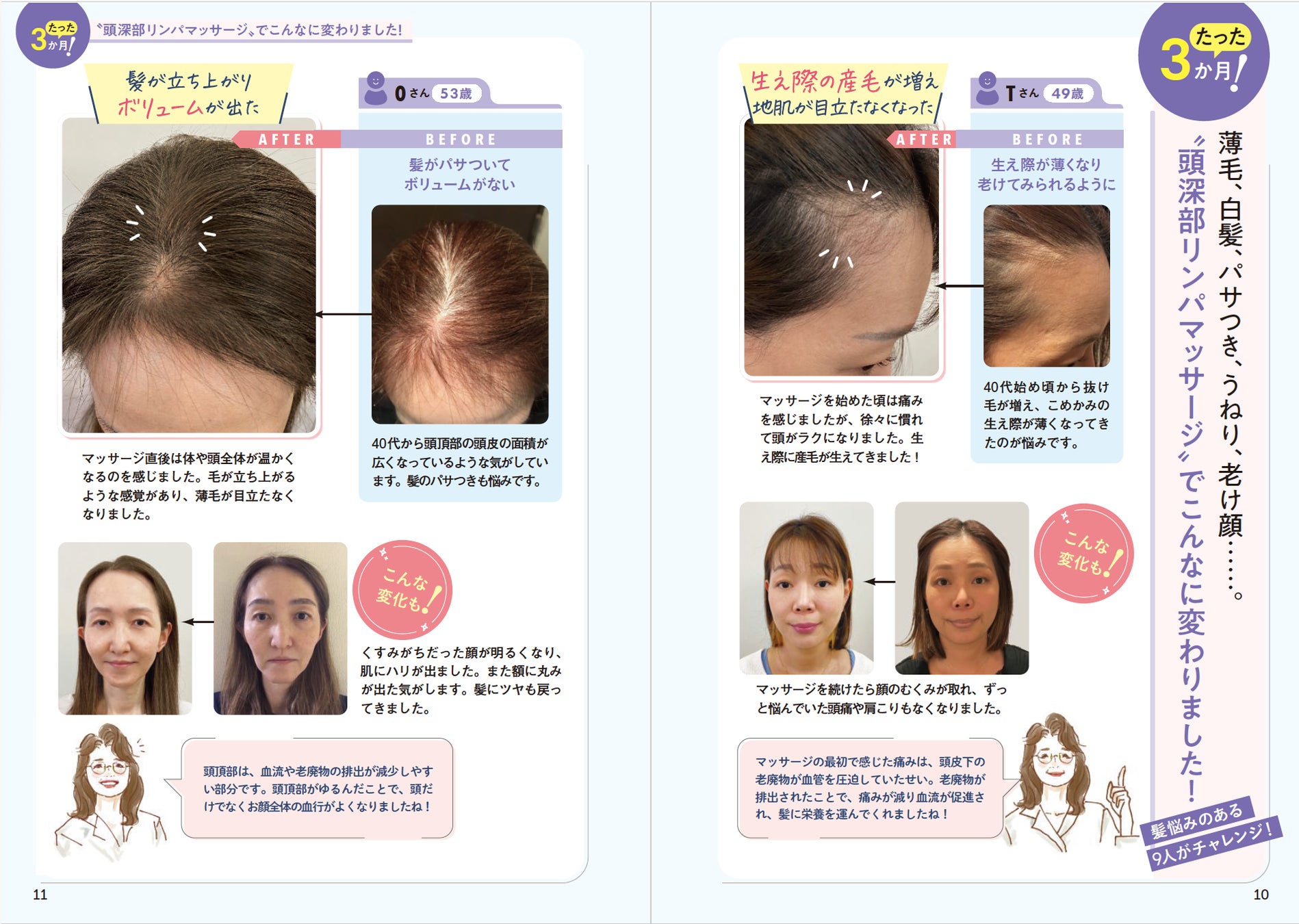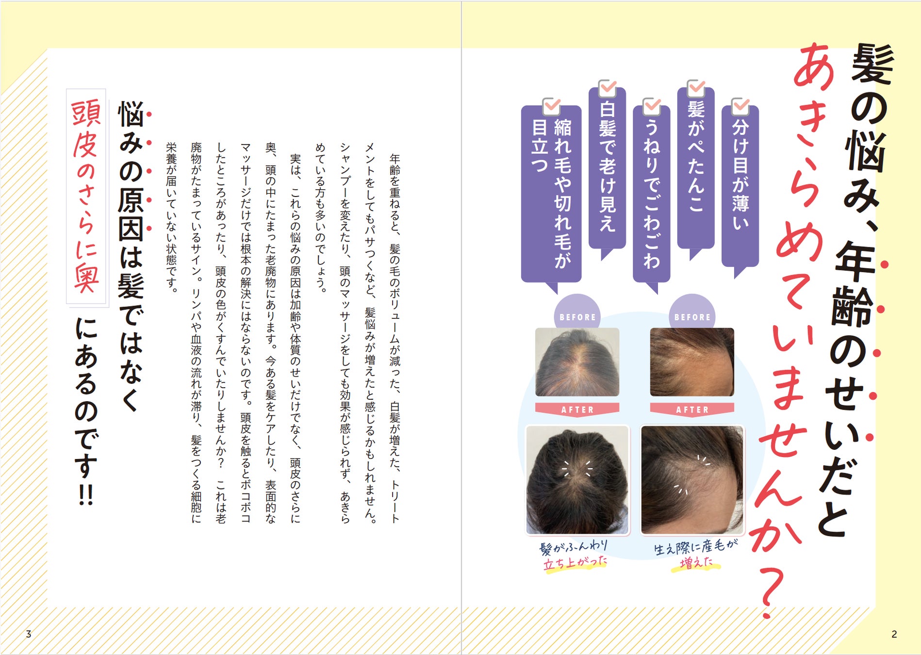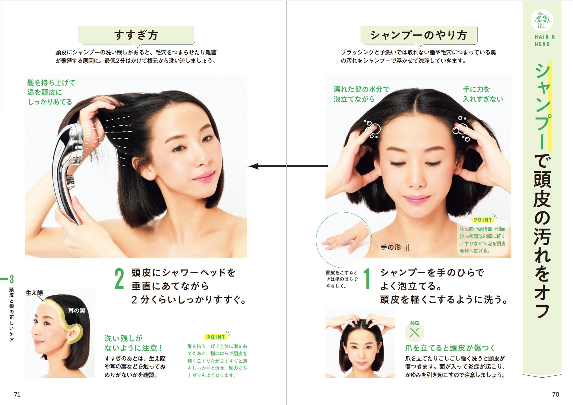 頭皮や髪を健康に保つシャンプーの方法、頭皮を傷めないドライヤーの使い方、頭皮の血流を促すブラッシング法など、日常的に取り入れられる美髪を育てるためのケア方法も詳細に説明しています。
