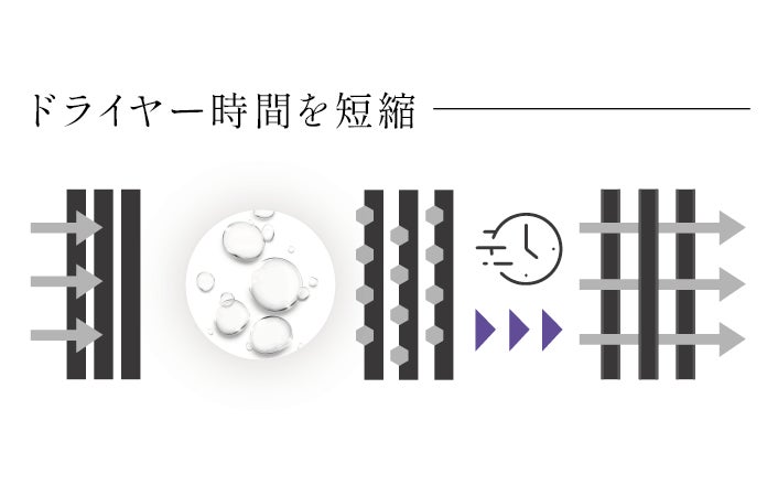 ドライヤーの時間が短縮されるとともに、「保護膜」がドライヤーの熱を遮断することで髪が受ける熱のダメージが軽減されます。