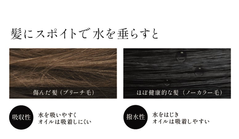 ダメージ髪は「水分を吸収しやすく、油分を吸収しにくい。」性質があります。「パワーミスト」はウォーター仕様のため、ケア成分の吸収がよく、効果的にダメージ部位に届き、逆に健康な髪には付着しにくいため、過激なケアにもなりません。
