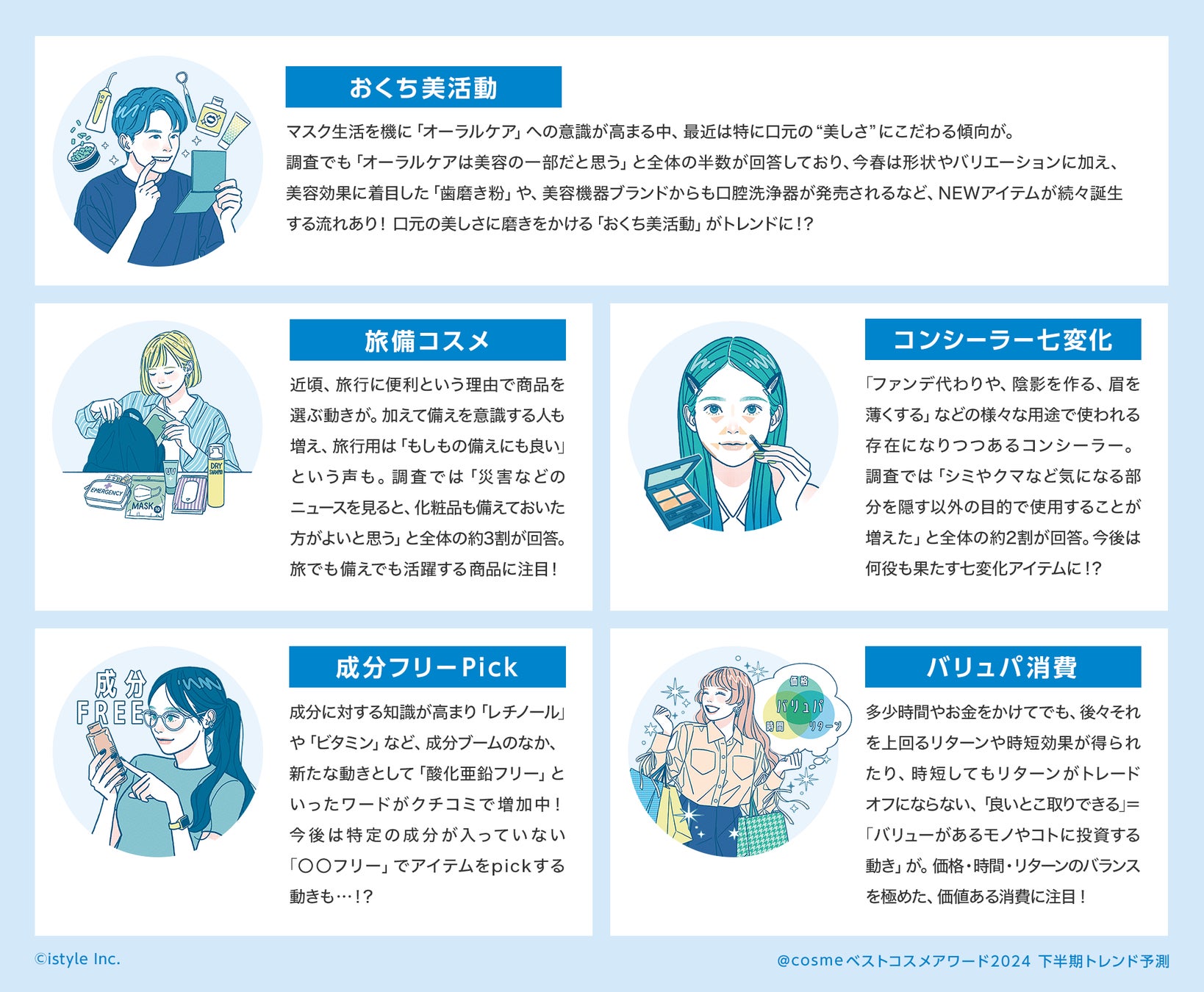株式会社アイスタイル(代表取締役社長 遠藤 宗、以下、アイスタイル)は、2024年6月6日(木)、「@cosmeベストコスメアワード2024下半期トレンド予測」を発表いたしました。