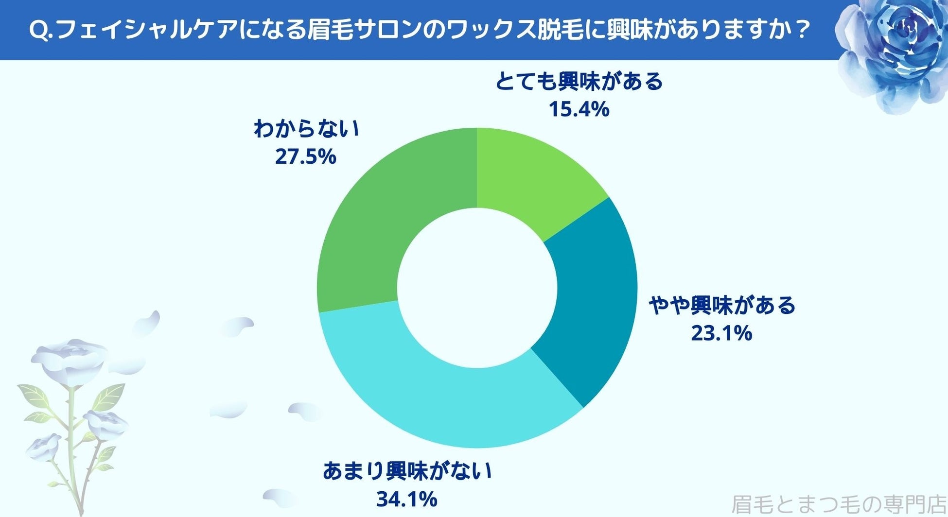 フェイシャルケアになる眉毛サロンのワックス脱毛に興味があるかお聞きしたところ「とても興味がある(15.4%)」、「やや興味がある(23.1%)」、「あまり興味がない(34.1%)」、「わからない(27.5%)」という結果になりました。