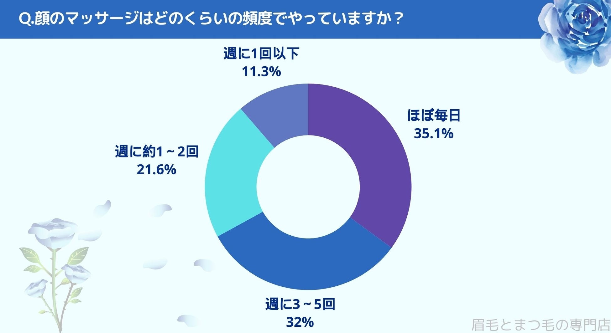 顔のマッサージをどのくらいの頻度でやっているかお聞きしたところ「ほぼ毎日(35.1%)」、「週に約3~5回(32%)」、「週に約1~2回(21.6%)」、「週に1回以下(11.3%)」という結果になりました。