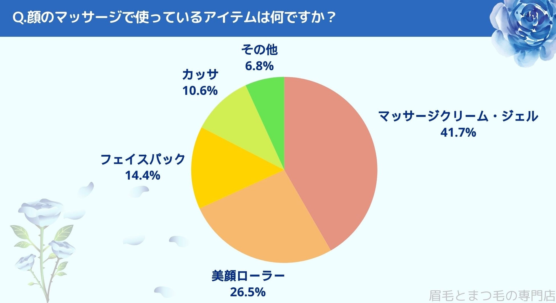 顔のマッサージで使っているアイテムをお聞きしたところ「マッサージクリーム・ジェル(41.7%)」、「美顔ローラ―(26.5%)」、「フェイスパック(14.4%)」、「カッサ(10.6%)」、「その他(6.8%)」という結果になりました。