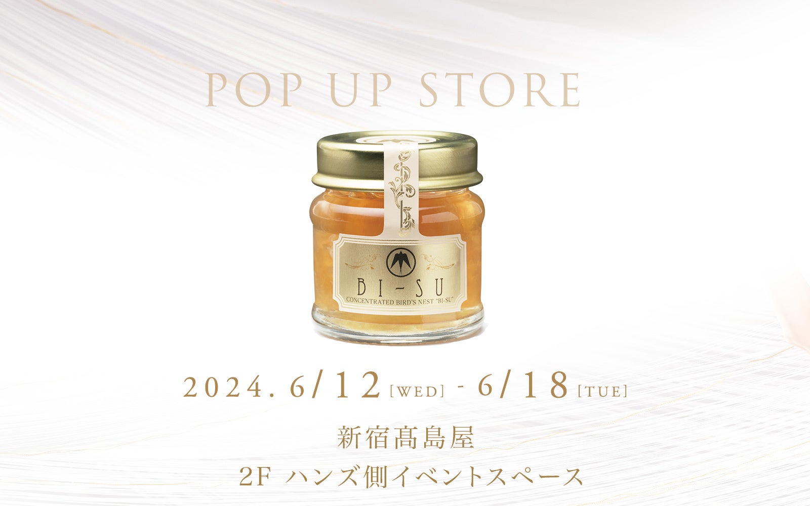 大人気のBI-SUエキスゼリースティックをはじめ、希少な天然アナツバメの巣をまるごと瓶詰めした「BI-SU16(食べるタイプ)」も特別に数量限定にてご用意いたしました。他にもシャンプーなどヘアケア商品、ローションやセラムなどコスメ商品も多数ご用意し、天然アナツバメの巣の美容成分を贅沢に配合したラインナップとなっております。梅雨から夏にかけてのお肌のケアに適したラインナップを取り揃えておりますので、お近くにいらした際には、ぜひこの機会にお立ちよりくださいませ。