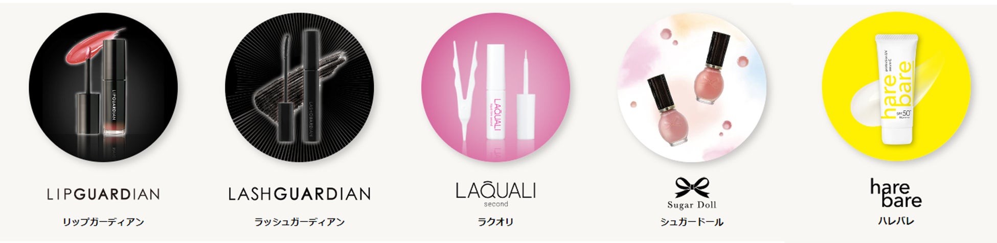 現在では、大人の上質キレイの“守護神”としてトレンド感がありながらも使いやすく、SNSでも度々話題となっているリップメイクシリーズ「リップガーディアン」をはじめ、強さを引き出すアイメイクの“守護神”として誕生した「ラッシュガーディアン」。自然なふたえがつくれる、ふたえまぶた化粧品として発売からご好評いただいている「ラクオリ」。4つの機能がオールインワンになった、ひと塗りで指先のキレイをサポートするネイルカラーシリーズ「シュガードール」。3種のビタミンC誘導体(うるおい成分)を配合した心地よい使用感の日やけ止めとして支持の厚い「ハレバレ」など、多彩な商品を提供しています。