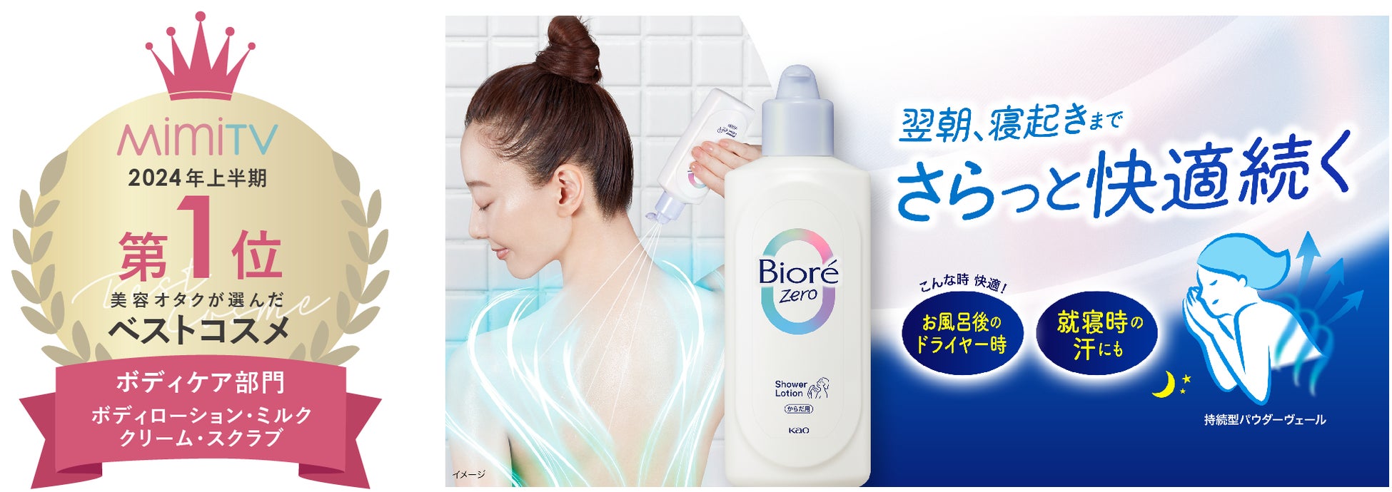 花王株式会社の『ビオレZero お風呂で使う汗ケアローション』は、「2024年上半期 MimiTVベストコスメ」の「ボディケア部門 ボディローション・ミルク・クリーム・スクラブ」にて第1位を受賞しました。