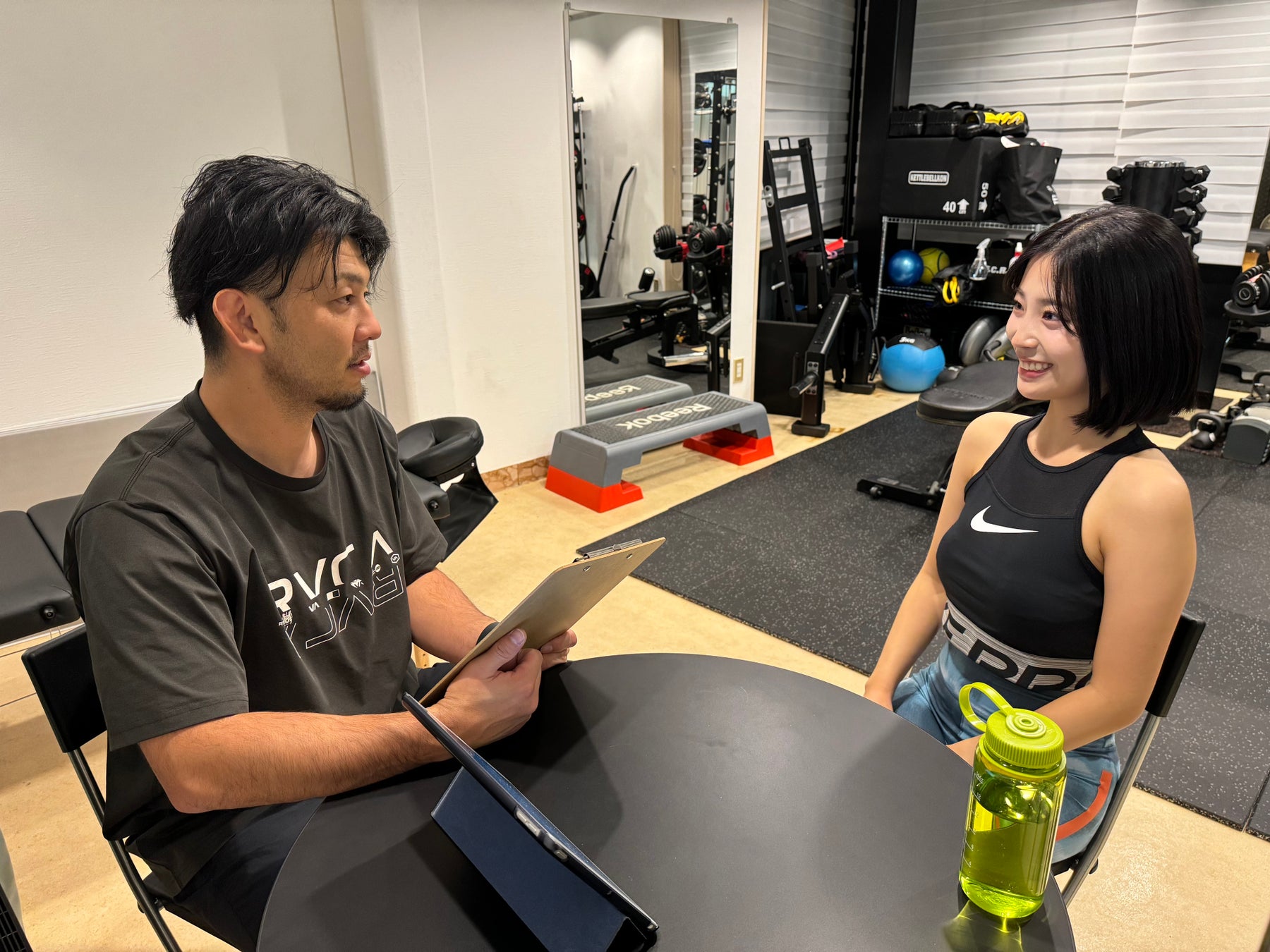 初回トレーニングでのカウンセリング、ヒアリングでトレーナーとお客様の目標達成へのプロセスを共有し、常に最短でゴールに導けるよう毎回のトレーニングにおいてもコミュニケーションとカラダの状態の理解、共有を大切にしています。