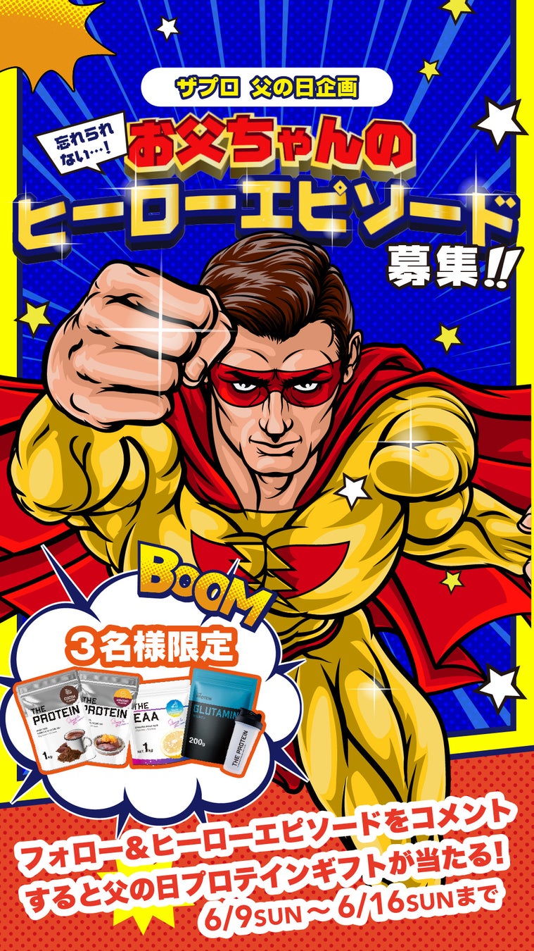 累計販売数50万個突破の THE PROTEIN(通称:ザプロ)から【父の日】に合わせた『ヒーローエピソード』を公式Instagramで大募集いたします。