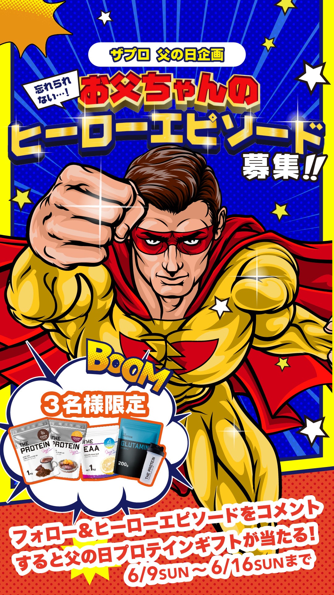 累計販売数50万個突破の THE PROTEIN(通称:ザプロ)から【父の日】に合わせた『ヒーローエピソード』を公式Instagramで大募集いたします。