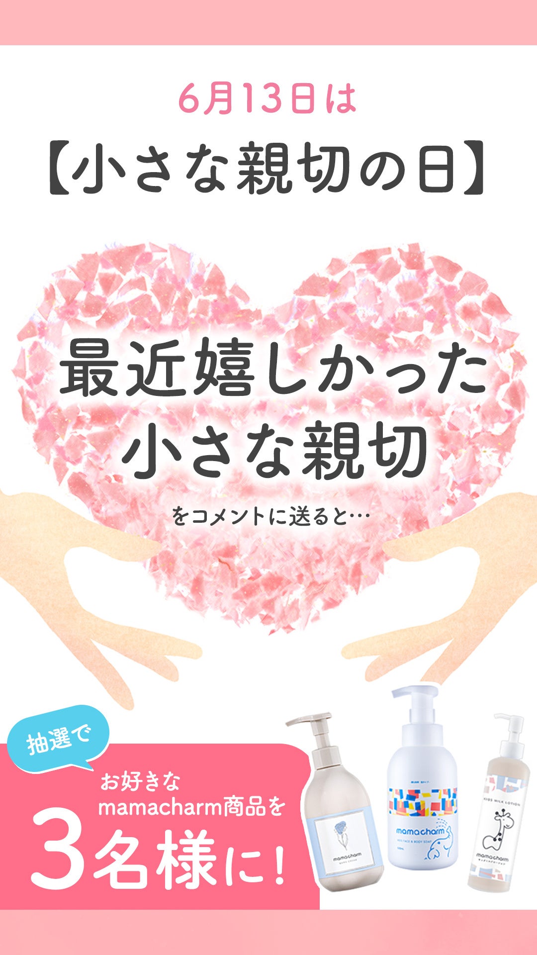 6月13日は「小さな親切の日」と言うことで妊娠・出産・子育ての見方をコンセプトにInstagramで情報を発信するママチャームから「最近嬉しかった小さな親切」の募集を開始します。普段子育てをされている方は日常で起こる「小さな親切」を感じる瞬間は多いのではないでしょうか。そんなママチャームをフォローしてくださっている方が日常で感じた「嬉しかった小さな親切」を私たちも知りたいと言う思いからこの企画を立案しました。