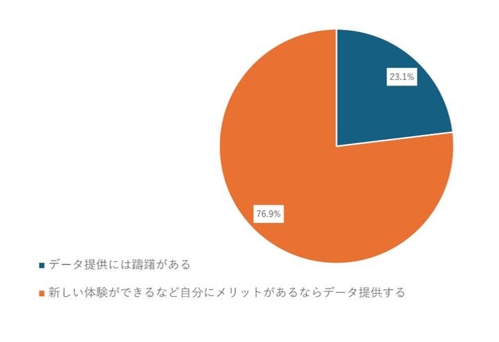 個人データの第三者提供に関して、77%の参加者が「新しい体験ができるなど、自分にメリットがあるなら提供する」と、提供するメリットが明瞭であればデータ提供に前向きな意見が多数を占めました。