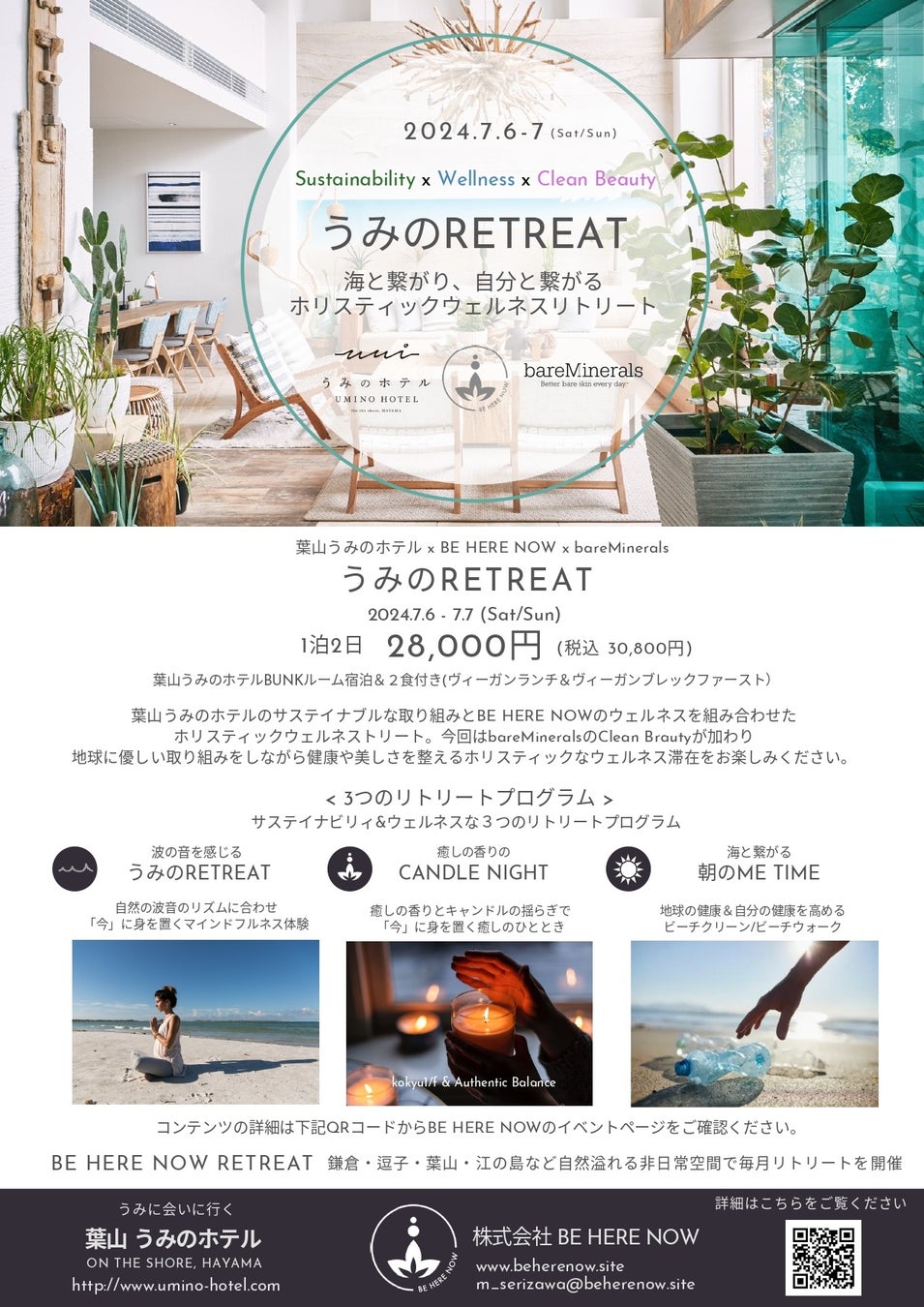 【ベアミネラル】7月6日(土)「葉山うみのホテル」にて、海と繋がり、自分と繋がるウェルネスリトリートを実施。マインドフルネスブランド「BE HERE NOW」との3社コラボイベントを開催